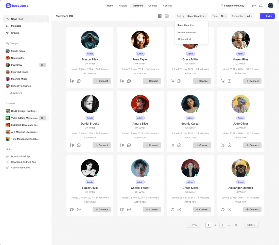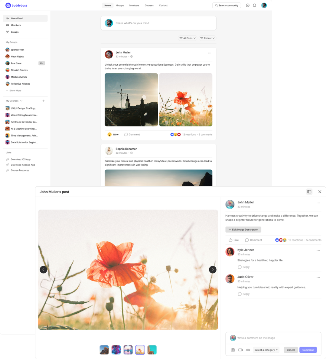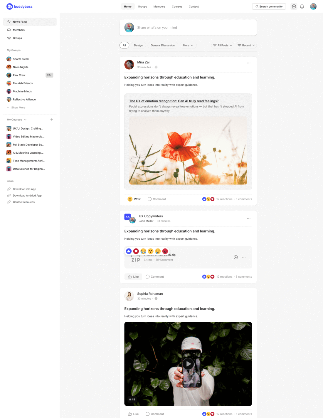 BuddyBoss Platform is an open-source WordPress framework for building online communities, membership sites, and eLearning environments. Originally a fork of BuddyPress, the platform has been upgraded with extended functionality and modern UI, available either through ReadyLaunch (the free templating solution) or the BuddyBoss Theme. As a Senior Front-End Developer, I contributed across the core platform and ecosystem, delivering frontend solutions that improved user experience, scalability, and performance.